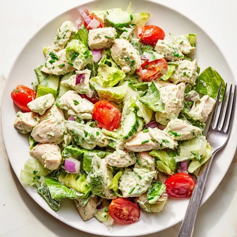 Pin it Tender chunks of chicken breast are tossed with a creamy avocado ranch dressing, fresh vegetables, and herbs, creating a refreshing and flavorful salad perfect for lunch or a light dinner. This American-style main dish is both satisfying and simple to prepare, making it a go-to choice for a healthy meal.