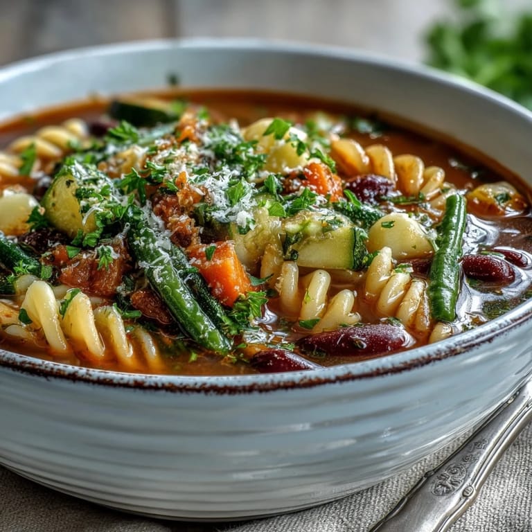 This Minestrone soup pairs beautifully with a side of crusty Italian bread, perfect for soaking up the flavorful tomato broth. For a complete dining experience, serve it alongside a glass of light red wine, such as Chianti, to complement the earthy herbs and savory vegetables.