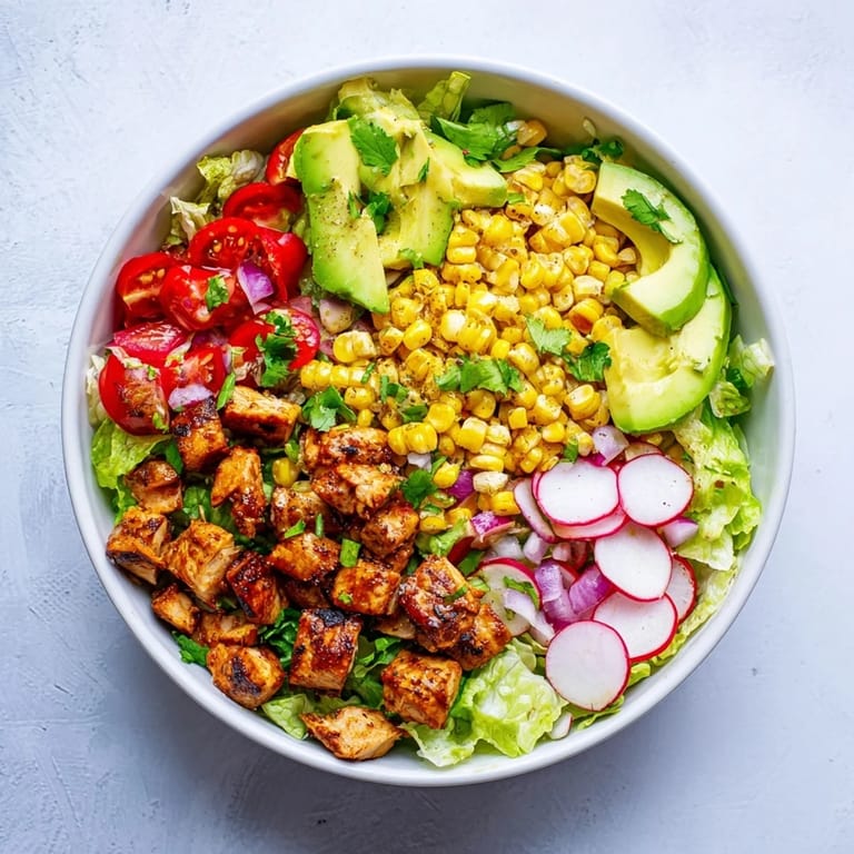 Yes! Store the components separately: grilled chicken, corn, dressing, and chopped vegetables. Keep the avocado diced and tossed with a little lime juice to prevent browning. Assemble individual portions when ready to eat for the best texture and appearance.